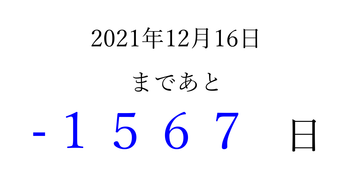 2021年12月16日(木)は もう 0000 日過ぎました 追加すると、トップページからすぐ選べるようになります ※2026/04/01現在の結果です。 最新の状態に更新する ↓シェアして、タイムライン上にカウントダウンを表示しよう!↓ 📤 この結果を共有する Tweet シェア Threads Bluesky 別の日付でカウントダウン 2021年12月のカレンダー このページをブックマークに追加すると、いつでもカウントダウンを確認できます。 (PC: Ctrl+D / Mac: ⌘+D) hitome-notes.comでは以下のページも運営しています。 指定日と期間から日付を計算 | ガチャ確率計算・シミュレーション | プライバシー・ポリシー 運営者:Avocado