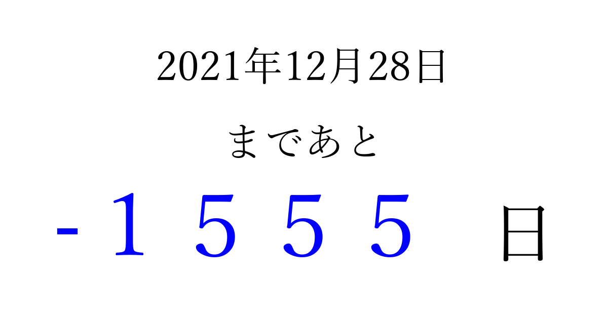 2021年12月28日(火)は もう 0000 日過ぎました 追加すると、トップページからすぐ選べるようになります ※2026/04/01現在の結果です。 最新の状態に更新する ↓シェアして、タイムライン上にカウントダウンを表示しよう!↓ 📤 この結果を共有する Tweet シェア Threads Bluesky 別の日付でカウントダウン 2021年12月のカレンダー このページをブックマークに追加すると、いつでもカウントダウンを確認できます。 (PC: Ctrl+D / Mac: ⌘+D) hitome-notes.comでは以下のページも運営しています。 指定日と期間から日付を計算 | ガチャ確率計算・シミュレーション | プライバシー・ポリシー 運営者:Avocado