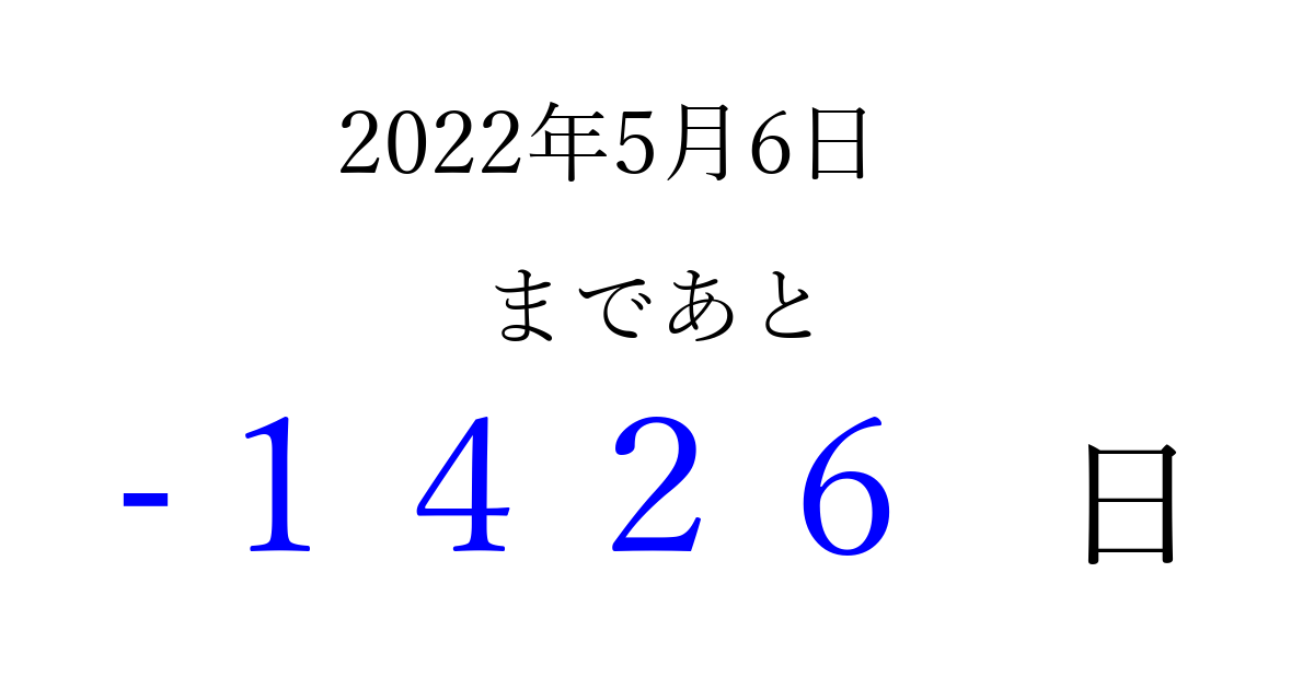 2022年5月6日(金)は もう 0000 日過ぎました 追加すると、トップページからすぐ選べるようになります ※2026/04/01現在の結果です。 最新の状態に更新する ↓シェアして、タイムライン上にカウントダウンを表示しよう!↓ 📤 この結果を共有する Tweet シェア Threads Bluesky 別の日付でカウントダウン 2022年5月のカレンダー このページをブックマークに追加すると、いつでもカウントダウンを確認できます。 (PC: Ctrl+D / Mac: ⌘+D) hitome-notes.comでは以下のページも運営しています。 指定日と期間から日付を計算 | ガチャ確率計算・シミュレーション | プライバシー・ポリシー 運営者:Avocado