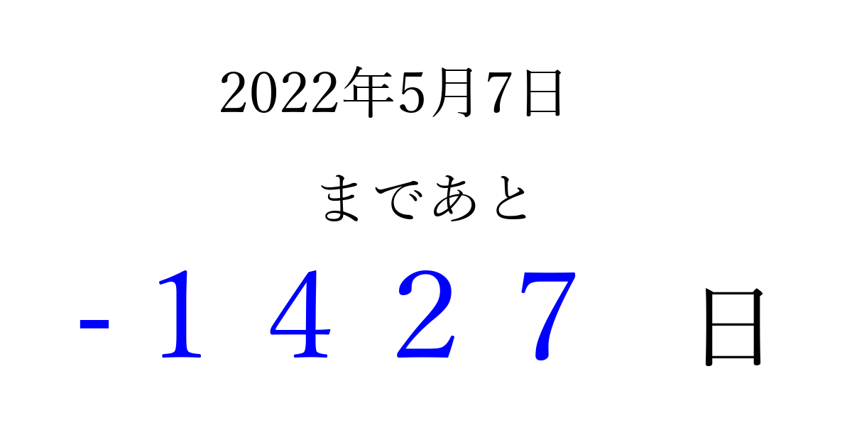 2022年5月7日(土)は もう 0000 日過ぎました 追加すると、トップページからすぐ選べるようになります ※2026/04/03現在の結果です。 最新の状態に更新する ↓シェアして、タイムライン上にカウントダウンを表示しよう!↓ 📤 この結果を共有する Tweet シェア Threads Bluesky 別の日付でカウントダウン 2022年5月のカレンダー このページをブックマークに追加すると、いつでもカウントダウンを確認できます。 (PC: Ctrl+D / Mac: ⌘+D) hitome-notes.comでは以下のページも運営しています。 指定日と期間から日付を計算 | ガチャ確率計算・シミュレーション | プライバシー・ポリシー 運営者:Avocado