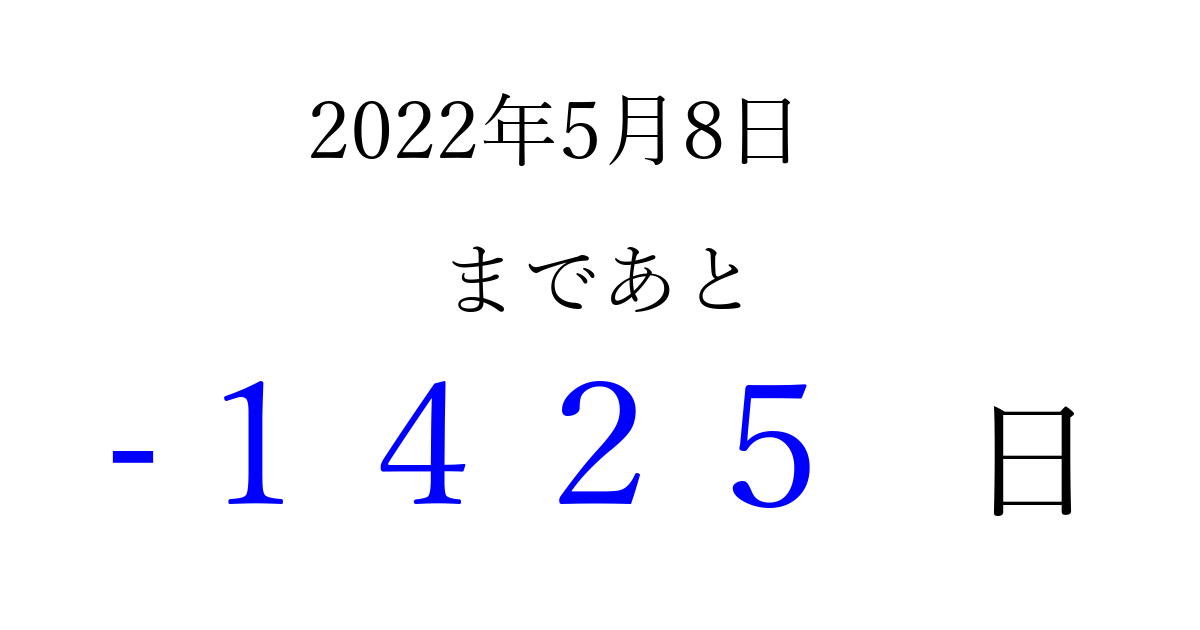 2022年5月8日(日)は もう 0000 日過ぎました 追加すると、トップページからすぐ選べるようになります ※2026/04/02現在の結果です。 最新の状態に更新する ↓シェアして、タイムライン上にカウントダウンを表示しよう!↓ 📤 この結果を共有する Tweet シェア Threads Bluesky 別の日付でカウントダウン 2022年5月のカレンダー このページをブックマークに追加すると、いつでもカウントダウンを確認できます。 (PC: Ctrl+D / Mac: ⌘+D) hitome-notes.comでは以下のページも運営しています。 指定日と期間から日付を計算 | ガチャ確率計算・シミュレーション | プライバシー・ポリシー 運営者:Avocado
