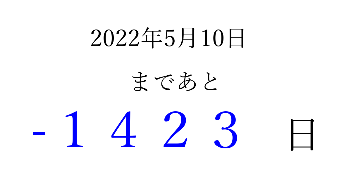 2022年5月10日(火)は もう 0000 日過ぎました 追加すると、トップページからすぐ選べるようになります ※2026/04/02現在の結果です。 最新の状態に更新する ↓シェアして、タイムライン上にカウントダウンを表示しよう!↓ 📤 この結果を共有する Tweet シェア Threads Bluesky 別の日付でカウントダウン 2022年5月のカレンダー このページをブックマークに追加すると、いつでもカウントダウンを確認できます。 (PC: Ctrl+D / Mac: ⌘+D) hitome-notes.comでは以下のページも運営しています。 指定日と期間から日付を計算 | ガチャ確率計算・シミュレーション | プライバシー・ポリシー 運営者:Avocado