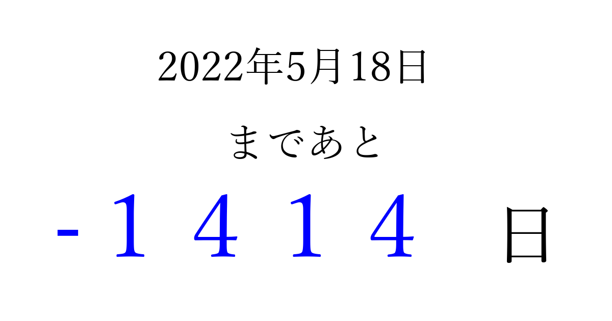 2022年5月18日(水)は もう 0000 日過ぎました 追加すると、トップページからすぐ選べるようになります ※2026/04/01現在の結果です。 最新の状態に更新する ↓シェアして、タイムライン上にカウントダウンを表示しよう!↓ 📤 この結果を共有する Tweet シェア Threads Bluesky 別の日付でカウントダウン 2022年5月のカレンダー このページをブックマークに追加すると、いつでもカウントダウンを確認できます。 (PC: Ctrl+D / Mac: ⌘+D) hitome-notes.comでは以下のページも運営しています。 指定日と期間から日付を計算 | ガチャ確率計算・シミュレーション | プライバシー・ポリシー 運営者:Avocado