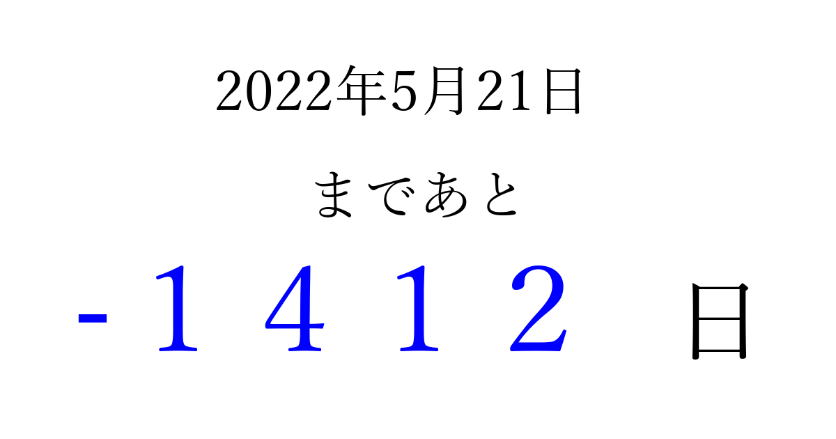 2022年5月21日(土)は もう 0000 日過ぎました 追加すると、トップページからすぐ選べるようになります ※2026/04/02現在の結果です。 最新の状態に更新する ↓シェアして、タイムライン上にカウントダウンを表示しよう!↓ 📤 この結果を共有する Tweet シェア Threads Bluesky 別の日付でカウントダウン 2022年5月のカレンダー このページをブックマークに追加すると、いつでもカウントダウンを確認できます。 (PC: Ctrl+D / Mac: ⌘+D) hitome-notes.comでは以下のページも運営しています。 指定日と期間から日付を計算 | ガチャ確率計算・シミュレーション | プライバシー・ポリシー 運営者:Avocado