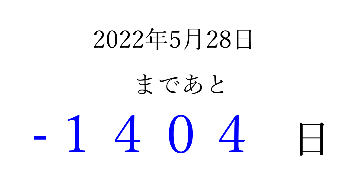 2022年5月28日(土)は もう 0000 日過ぎました 追加すると、トップページからすぐ選べるようになります ※2026/04/01現在の結果です。 最新の状態に更新する ↓シェアして、タイムライン上にカウントダウンを表示しよう!↓ 📤 この結果を共有する Tweet シェア Threads Bluesky 別の日付でカウントダウン 2022年5月のカレンダー このページをブックマークに追加すると、いつでもカウントダウンを確認できます。 (PC: Ctrl+D / Mac: ⌘+D) hitome-notes.comでは以下のページも運営しています。 指定日と期間から日付を計算 | ガチャ確率計算・シミュレーション | プライバシー・ポリシー 運営者:Avocado