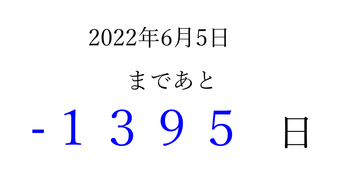 2022年6月5日(日)は もう 0000 日過ぎました 追加すると、トップページからすぐ選べるようになります ※2026/03/31現在の結果です。 最新の状態に更新する ↓シェアして、タイムライン上にカウントダウンを表示しよう!↓ 📤 この結果を共有する Tweet シェア Threads Bluesky 別の日付でカウントダウン 2022年6月のカレンダー このページをブックマークに追加すると、いつでもカウントダウンを確認できます。 (PC: Ctrl+D / Mac: ⌘+D) hitome-notes.comでは以下のページも運営しています。 指定日と期間から日付を計算 | ガチャ確率計算・シミュレーション | プライバシー・ポリシー 運営者:Avocado