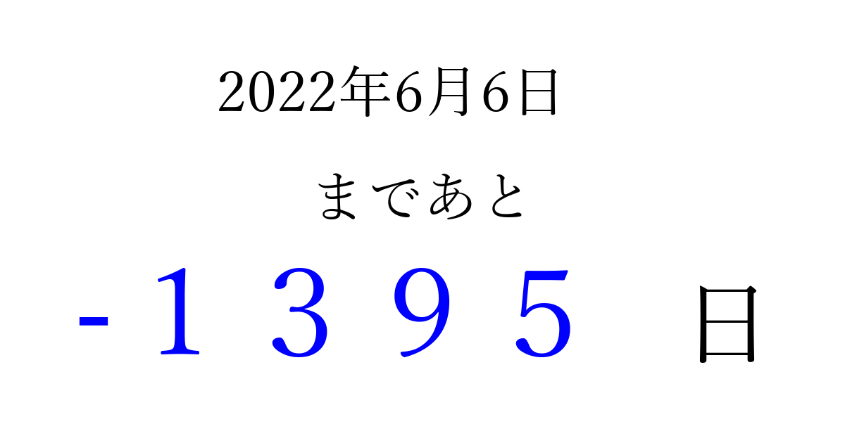 2022年6月6日(月)は もう 0000 日過ぎました 追加すると、トップページからすぐ選べるようになります ※2026/04/01現在の結果です。 最新の状態に更新する ↓シェアして、タイムライン上にカウントダウンを表示しよう!↓ 📤 この結果を共有する Tweet シェア Threads Bluesky 別の日付でカウントダウン 2022年6月のカレンダー このページをブックマークに追加すると、いつでもカウントダウンを確認できます。 (PC: Ctrl+D / Mac: ⌘+D) hitome-notes.comでは以下のページも運営しています。 指定日と期間から日付を計算 | ガチャ確率計算・シミュレーション | プライバシー・ポリシー 運営者:Avocado