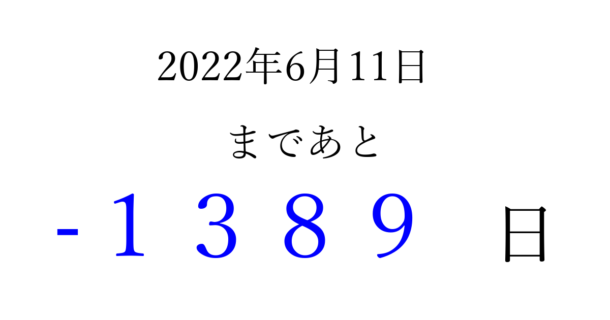 2022年6月11日(土)は もう 0000 日過ぎました 追加すると、トップページからすぐ選べるようになります ※2026/03/31現在の結果です。 最新の状態に更新する ↓シェアして、タイムライン上にカウントダウンを表示しよう!↓ 📤 この結果を共有する Tweet シェア Threads Bluesky 別の日付でカウントダウン 2022年6月のカレンダー このページをブックマークに追加すると、いつでもカウントダウンを確認できます。 (PC: Ctrl+D / Mac: ⌘+D) hitome-notes.comでは以下のページも運営しています。 指定日と期間から日付を計算 | ガチャ確率計算・シミュレーション | プライバシー・ポリシー 運営者:Avocado