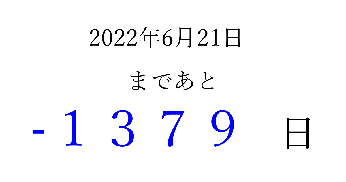 2022年6月21日(火)は もう 0000 日過ぎました 追加すると、トップページからすぐ選べるようになります ※2026/03/31現在の結果です。 最新の状態に更新する ↓シェアして、タイムライン上にカウントダウンを表示しよう!↓ 📤 この結果を共有する Tweet シェア Threads Bluesky 別の日付でカウントダウン 2022年6月のカレンダー このページをブックマークに追加すると、いつでもカウントダウンを確認できます。 (PC: Ctrl+D / Mac: ⌘+D) hitome-notes.comでは以下のページも運営しています。 指定日と期間から日付を計算 | ガチャ確率計算・シミュレーション | プライバシー・ポリシー 運営者:Avocado