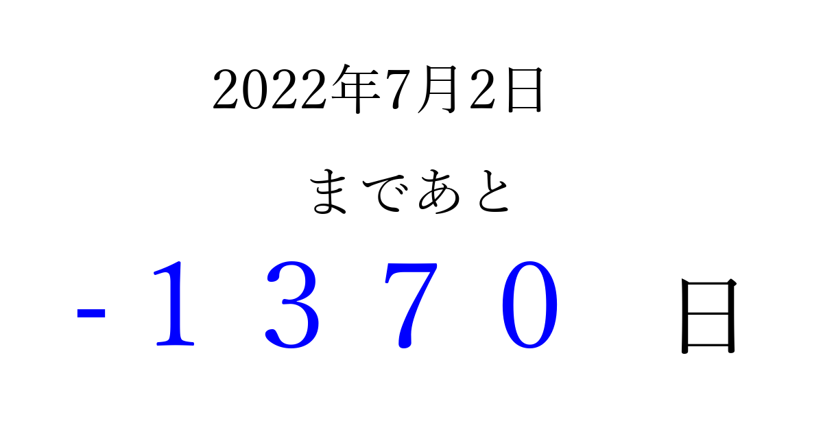 2022年7月2日(土)は もう 0000 日過ぎました 追加すると、トップページからすぐ選べるようになります ※2026/04/02現在の結果です。 最新の状態に更新する ↓シェアして、タイムライン上にカウントダウンを表示しよう!↓ 📤 この結果を共有する Tweet シェア Threads Bluesky 別の日付でカウントダウン 2022年7月のカレンダー このページをブックマークに追加すると、いつでもカウントダウンを確認できます。 (PC: Ctrl+D / Mac: ⌘+D) hitome-notes.comでは以下のページも運営しています。 指定日と期間から日付を計算 | ガチャ確率計算・シミュレーション | プライバシー・ポリシー 運営者:Avocado