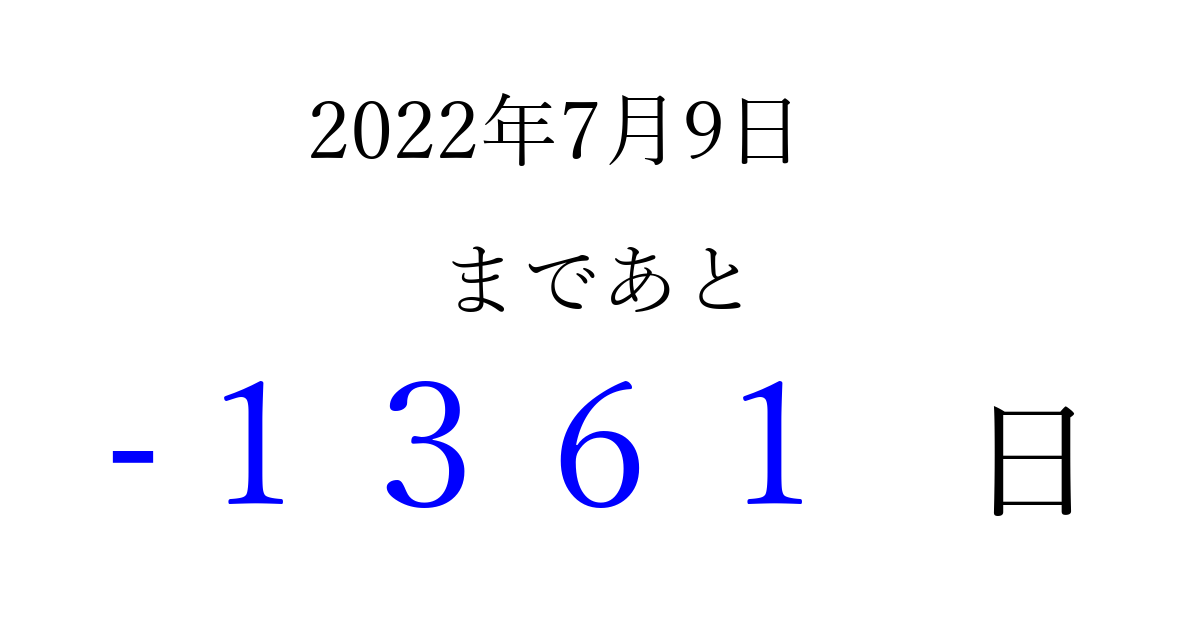 2022年7月9日(土)は もう 0000 日過ぎました 追加すると、トップページからすぐ選べるようになります ※2026/03/31現在の結果です。 最新の状態に更新する ↓シェアして、タイムライン上にカウントダウンを表示しよう!↓ 📤 この結果を共有する Tweet シェア Threads Bluesky 別の日付でカウントダウン 2022年7月のカレンダー このページをブックマークに追加すると、いつでもカウントダウンを確認できます。 (PC: Ctrl+D / Mac: ⌘+D) hitome-notes.comでは以下のページも運営しています。 指定日と期間から日付を計算 | ガチャ確率計算・シミュレーション | プライバシー・ポリシー 運営者:Avocado