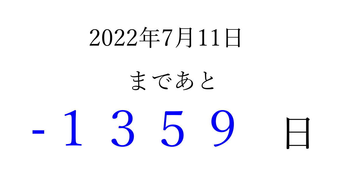 2022年7月11日(月)は もう 0000 日過ぎました 追加すると、トップページからすぐ選べるようになります ※2026/03/31現在の結果です。 最新の状態に更新する ↓シェアして、タイムライン上にカウントダウンを表示しよう!↓ 📤 この結果を共有する Tweet シェア Threads Bluesky 別の日付でカウントダウン 2022年7月のカレンダー このページをブックマークに追加すると、いつでもカウントダウンを確認できます。 (PC: Ctrl+D / Mac: ⌘+D) hitome-notes.comでは以下のページも運営しています。 指定日と期間から日付を計算 | ガチャ確率計算・シミュレーション | プライバシー・ポリシー 運営者:Avocado