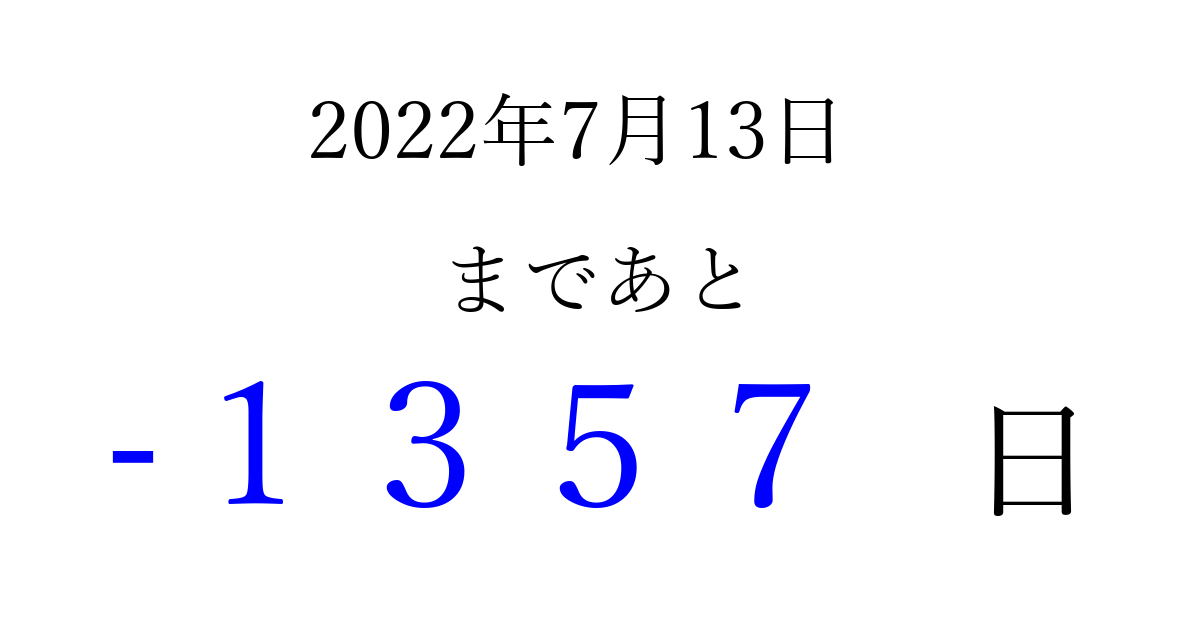 2022年7月13日(水)は もう 0000 日過ぎました 追加すると、トップページからすぐ選べるようになります ※2026/03/31現在の結果です。 最新の状態に更新する ↓シェアして、タイムライン上にカウントダウンを表示しよう!↓ 📤 この結果を共有する Tweet シェア Threads Bluesky 別の日付でカウントダウン 2022年7月のカレンダー このページをブックマークに追加すると、いつでもカウントダウンを確認できます。 (PC: Ctrl+D / Mac: ⌘+D) hitome-notes.comでは以下のページも運営しています。 指定日と期間から日付を計算 | ガチャ確率計算・シミュレーション | プライバシー・ポリシー 運営者:Avocado