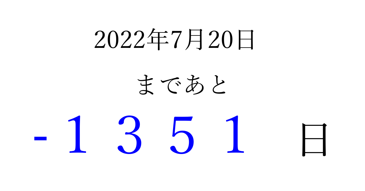 2022年7月20日(水)は もう 0000 日過ぎました 追加すると、トップページからすぐ選べるようになります ※2026/04/01現在の結果です。 最新の状態に更新する ↓シェアして、タイムライン上にカウントダウンを表示しよう!↓ 📤 この結果を共有する Tweet シェア Threads Bluesky 別の日付でカウントダウン 2022年7月のカレンダー このページをブックマークに追加すると、いつでもカウントダウンを確認できます。 (PC: Ctrl+D / Mac: ⌘+D) hitome-notes.comでは以下のページも運営しています。 指定日と期間から日付を計算 | ガチャ確率計算・シミュレーション | プライバシー・ポリシー 運営者:Avocado