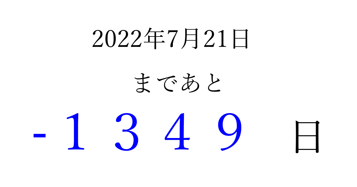 2022年7月21日(木)は もう 0000 日過ぎました 追加すると、トップページからすぐ選べるようになります ※2026/03/31現在の結果です。 最新の状態に更新する ↓シェアして、タイムライン上にカウントダウンを表示しよう!↓ 📤 この結果を共有する Tweet シェア Threads Bluesky 別の日付でカウントダウン 2022年7月のカレンダー このページをブックマークに追加すると、いつでもカウントダウンを確認できます。 (PC: Ctrl+D / Mac: ⌘+D) hitome-notes.comでは以下のページも運営しています。 指定日と期間から日付を計算 | ガチャ確率計算・シミュレーション | プライバシー・ポリシー 運営者:Avocado