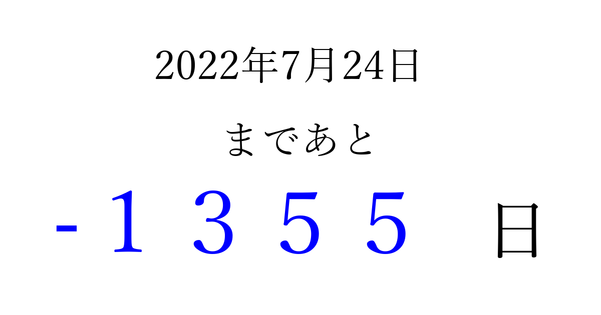2022年7月24日(日)は もう 0000 日過ぎました 追加すると、トップページからすぐ選べるようになります ※2026/04/09現在の結果です。 最新の状態に更新する ↓シェアして、タイムライン上にカウントダウンを表示しよう!↓ 📤 この結果を共有する Tweet シェア Threads Bluesky 別の日付でカウントダウン 2022年7月のカレンダー このページをブックマークに追加すると、いつでもカウントダウンを確認できます。 (PC: Ctrl+D / Mac: ⌘+D) hitome-notes.comでは以下のページも運営しています。 指定日と期間から日付を計算 | ガチャ確率計算・シミュレーション | プライバシー・ポリシー 運営者:Avocado