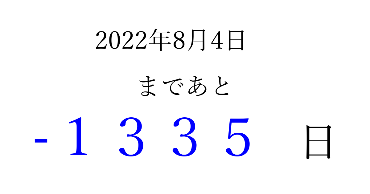 2022年8月4日(木)は もう 0000 日過ぎました 追加すると、トップページからすぐ選べるようになります ※2026/03/31現在の結果です。 最新の状態に更新する ↓シェアして、タイムライン上にカウントダウンを表示しよう!↓ 📤 この結果を共有する Tweet シェア Threads Bluesky 別の日付でカウントダウン 2022年8月のカレンダー このページをブックマークに追加すると、いつでもカウントダウンを確認できます。 (PC: Ctrl+D / Mac: ⌘+D) hitome-notes.comでは以下のページも運営しています。 指定日と期間から日付を計算 | ガチャ確率計算・シミュレーション | プライバシー・ポリシー 運営者:Avocado
