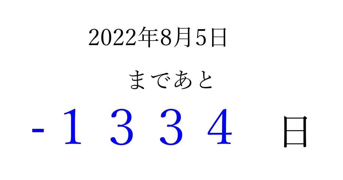 2022年8月5日(金)は もう 0000 日過ぎました 追加すると、トップページからすぐ選べるようになります ※2026/03/31現在の結果です。 最新の状態に更新する ↓シェアして、タイムライン上にカウントダウンを表示しよう!↓ 📤 この結果を共有する Tweet シェア Threads Bluesky 別の日付でカウントダウン 2022年8月のカレンダー このページをブックマークに追加すると、いつでもカウントダウンを確認できます。 (PC: Ctrl+D / Mac: ⌘+D) hitome-notes.comでは以下のページも運営しています。 指定日と期間から日付を計算 | ガチャ確率計算・シミュレーション | プライバシー・ポリシー 運営者:Avocado