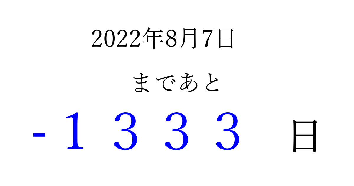 2022年8月7日(日)は もう 0000 日過ぎました 追加すると、トップページからすぐ選べるようになります ※2026/04/01現在の結果です。 最新の状態に更新する ↓シェアして、タイムライン上にカウントダウンを表示しよう!↓ 📤 この結果を共有する Tweet シェア Threads Bluesky 別の日付でカウントダウン 2022年8月のカレンダー このページをブックマークに追加すると、いつでもカウントダウンを確認できます。 (PC: Ctrl+D / Mac: ⌘+D) hitome-notes.comでは以下のページも運営しています。 指定日と期間から日付を計算 | ガチャ確率計算・シミュレーション | プライバシー・ポリシー 運営者:Avocado