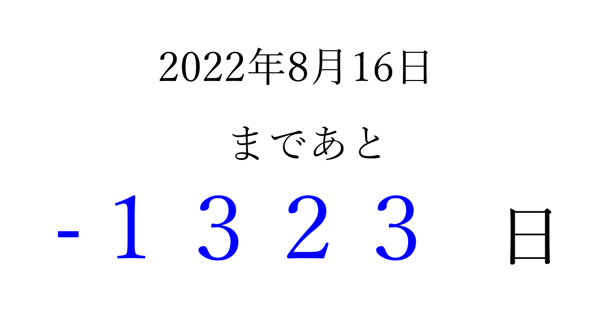 2022年8月16日(火)は もう 0000 日過ぎました 追加すると、トップページからすぐ選べるようになります ※2026/03/31現在の結果です。 最新の状態に更新する ↓シェアして、タイムライン上にカウントダウンを表示しよう!↓ 📤 この結果を共有する Tweet シェア Threads Bluesky 別の日付でカウントダウン 2022年8月のカレンダー このページをブックマークに追加すると、いつでもカウントダウンを確認できます。 (PC: Ctrl+D / Mac: ⌘+D) hitome-notes.comでは以下のページも運営しています。 指定日と期間から日付を計算 | ガチャ確率計算・シミュレーション | プライバシー・ポリシー 運営者:Avocado