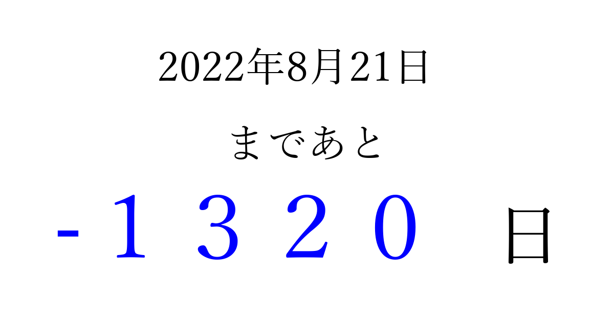 2022年8月21日(日)は もう 0000 日過ぎました 追加すると、トップページからすぐ選べるようになります ※2026/04/02現在の結果です。 最新の状態に更新する ↓シェアして、タイムライン上にカウントダウンを表示しよう!↓ 📤 この結果を共有する Tweet シェア Threads Bluesky 別の日付でカウントダウン 2022年8月のカレンダー このページをブックマークに追加すると、いつでもカウントダウンを確認できます。 (PC: Ctrl+D / Mac: ⌘+D) hitome-notes.comでは以下のページも運営しています。 指定日と期間から日付を計算 | ガチャ確率計算・シミュレーション | プライバシー・ポリシー 運営者:Avocado