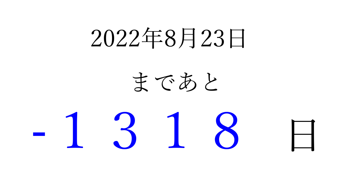 2022年8月23日(火)は もう 0000 日過ぎました 追加すると、トップページからすぐ選べるようになります ※2026/04/02現在の結果です。 最新の状態に更新する ↓シェアして、タイムライン上にカウントダウンを表示しよう!↓ 📤 この結果を共有する Tweet シェア Threads Bluesky 別の日付でカウントダウン 2022年8月のカレンダー このページをブックマークに追加すると、いつでもカウントダウンを確認できます。 (PC: Ctrl+D / Mac: ⌘+D) hitome-notes.comでは以下のページも運営しています。 指定日と期間から日付を計算 | ガチャ確率計算・シミュレーション | プライバシー・ポリシー 運営者:Avocado