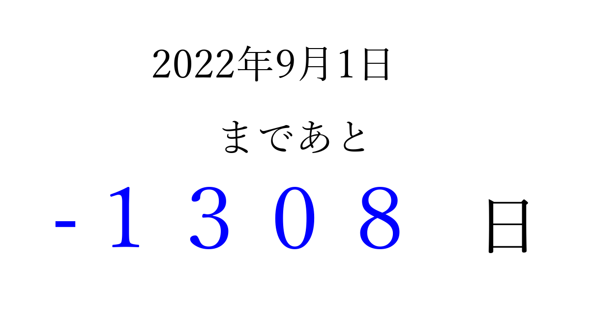 2022年9月1日(木)は もう 0000 日過ぎました 追加すると、トップページからすぐ選べるようになります ※2026/04/01現在の結果です。 最新の状態に更新する ↓シェアして、タイムライン上にカウントダウンを表示しよう!↓ 📤 この結果を共有する Tweet シェア Threads Bluesky 別の日付でカウントダウン 2022年9月のカレンダー このページをブックマークに追加すると、いつでもカウントダウンを確認できます。 (PC: Ctrl+D / Mac: ⌘+D) hitome-notes.comでは以下のページも運営しています。 指定日と期間から日付を計算 | ガチャ確率計算・シミュレーション | プライバシー・ポリシー 運営者:Avocado