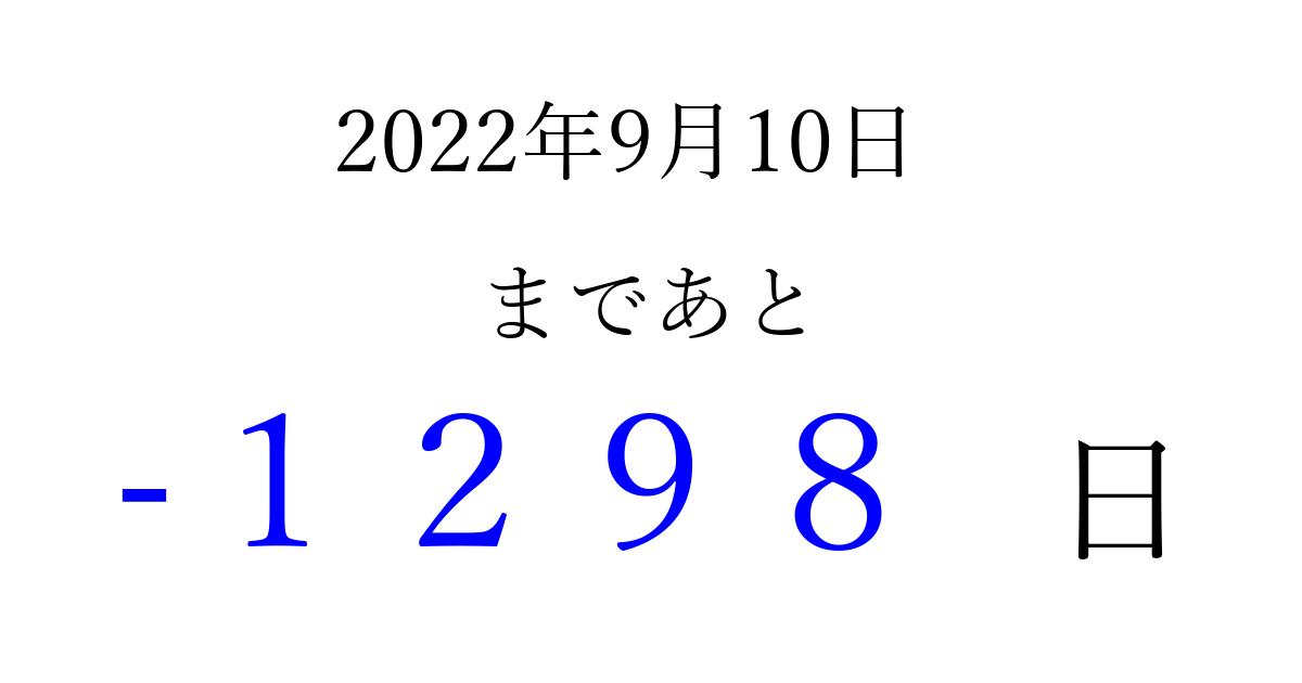 2022年9月10日(土)は もう 0000 日過ぎました 追加すると、トップページからすぐ選べるようになります ※2026/03/31現在の結果です。 最新の状態に更新する ↓シェアして、タイムライン上にカウントダウンを表示しよう!↓ 📤 この結果を共有する Tweet シェア Threads Bluesky 別の日付でカウントダウン 2022年9月のカレンダー このページをブックマークに追加すると、いつでもカウントダウンを確認できます。 (PC: Ctrl+D / Mac: ⌘+D) hitome-notes.comでは以下のページも運営しています。 指定日と期間から日付を計算 | ガチャ確率計算・シミュレーション | プライバシー・ポリシー 運営者:Avocado