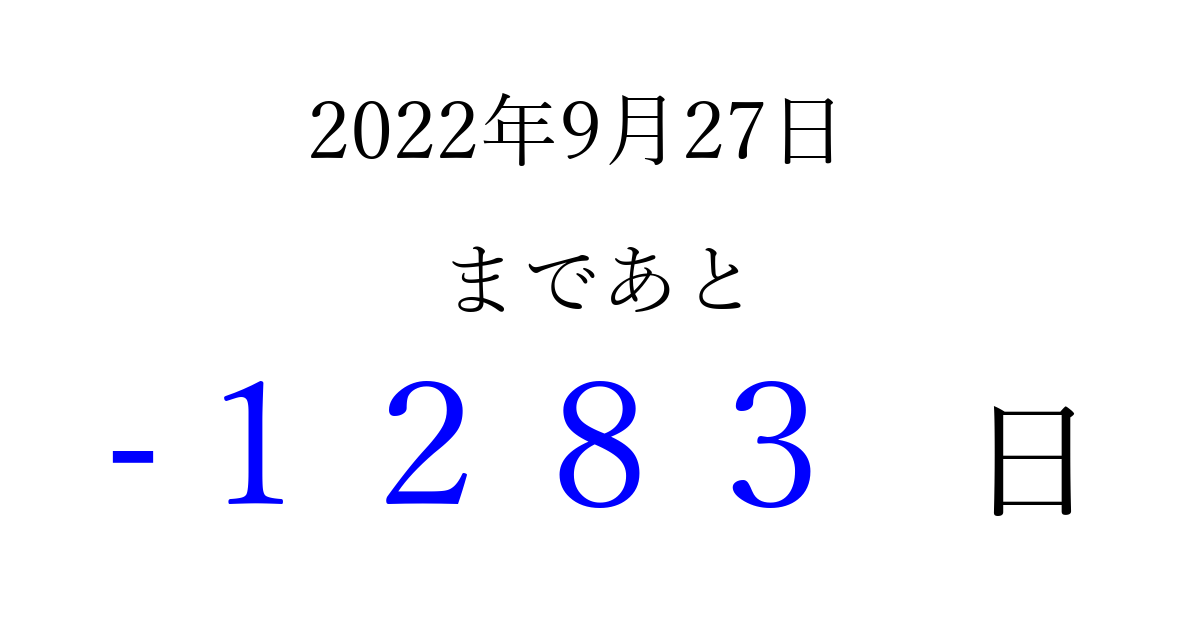 2022年9月27日(火)は もう 0000 日過ぎました 追加すると、トップページからすぐ選べるようになります ※2026/04/02現在の結果です。 最新の状態に更新する ↓シェアして、タイムライン上にカウントダウンを表示しよう!↓ 📤 この結果を共有する Tweet シェア Threads Bluesky 別の日付でカウントダウン 2022年9月のカレンダー このページをブックマークに追加すると、いつでもカウントダウンを確認できます。 (PC: Ctrl+D / Mac: ⌘+D) hitome-notes.comでは以下のページも運営しています。 指定日と期間から日付を計算 | ガチャ確率計算・シミュレーション | プライバシー・ポリシー 運営者:Avocado