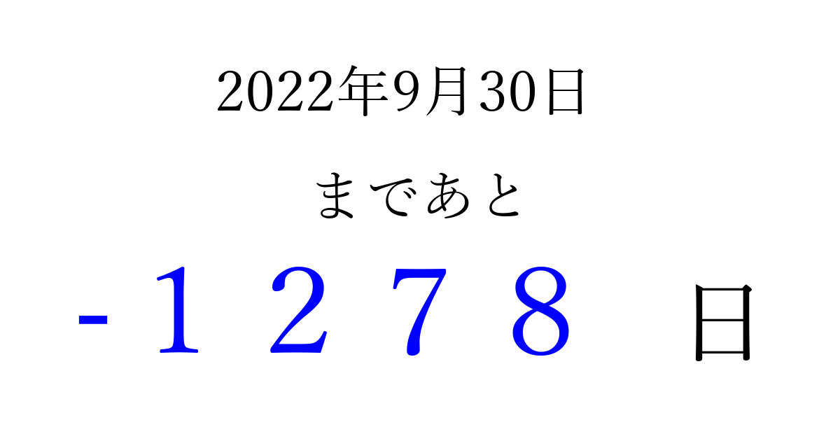 2022年9月30日(金)は もう 0000 日過ぎました 追加すると、トップページからすぐ選べるようになります ※2026/03/31現在の結果です。 最新の状態に更新する ↓シェアして、タイムライン上にカウントダウンを表示しよう!↓ 📤 この結果を共有する Tweet シェア Threads Bluesky 別の日付でカウントダウン 2022年9月のカレンダー このページをブックマークに追加すると、いつでもカウントダウンを確認できます。 (PC: Ctrl+D / Mac: ⌘+D) hitome-notes.comでは以下のページも運営しています。 指定日と期間から日付を計算 | ガチャ確率計算・シミュレーション | プライバシー・ポリシー 運営者:Avocado