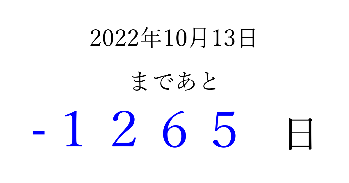 2022年10月13日(木)は もう 0000 日過ぎました 追加すると、トップページからすぐ選べるようになります ※2026/03/31現在の結果です。 最新の状態に更新する ↓シェアして、タイムライン上にカウントダウンを表示しよう!↓ 📤 この結果を共有する Tweet シェア Threads Bluesky 別の日付でカウントダウン 2022年10月のカレンダー このページをブックマークに追加すると、いつでもカウントダウンを確認できます。 (PC: Ctrl+D / Mac: ⌘+D) hitome-notes.comでは以下のページも運営しています。 指定日と期間から日付を計算 | ガチャ確率計算・シミュレーション | プライバシー・ポリシー 運営者:Avocado