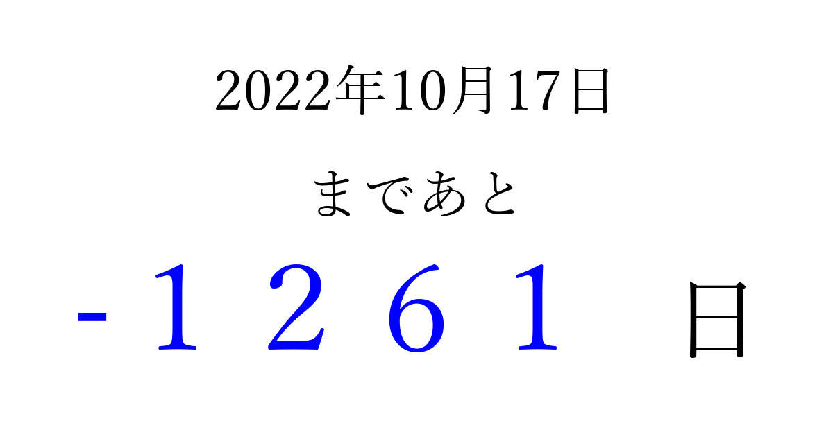 2022年10月17日(月)は もう 0000 日過ぎました 追加すると、トップページからすぐ選べるようになります ※2026/03/31現在の結果です。 最新の状態に更新する ↓シェアして、タイムライン上にカウントダウンを表示しよう!↓ 📤 この結果を共有する Tweet シェア Threads Bluesky 別の日付でカウントダウン 2022年10月のカレンダー このページをブックマークに追加すると、いつでもカウントダウンを確認できます。 (PC: Ctrl+D / Mac: ⌘+D) hitome-notes.comでは以下のページも運営しています。 指定日と期間から日付を計算 | ガチャ確率計算・シミュレーション | プライバシー・ポリシー 運営者:Avocado