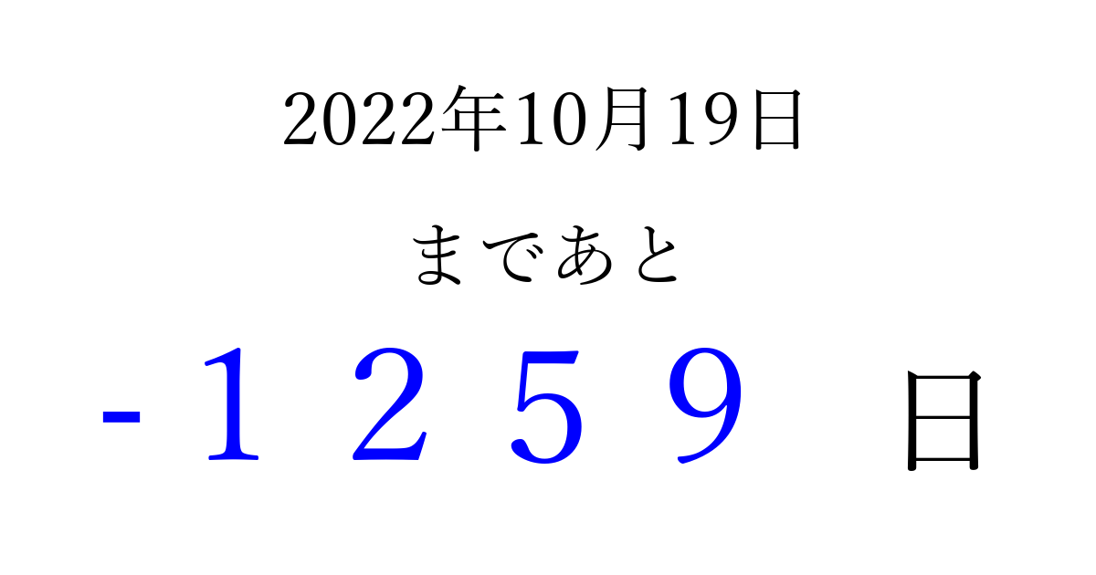 2022年10月19日(水)は もう 0000 日過ぎました 追加すると、トップページからすぐ選べるようになります ※2026/03/31現在の結果です。 最新の状態に更新する ↓シェアして、タイムライン上にカウントダウンを表示しよう!↓ 📤 この結果を共有する Tweet シェア Threads Bluesky 別の日付でカウントダウン 2022年10月のカレンダー このページをブックマークに追加すると、いつでもカウントダウンを確認できます。 (PC: Ctrl+D / Mac: ⌘+D) hitome-notes.comでは以下のページも運営しています。 指定日と期間から日付を計算 | ガチャ確率計算・シミュレーション | プライバシー・ポリシー 運営者:Avocado