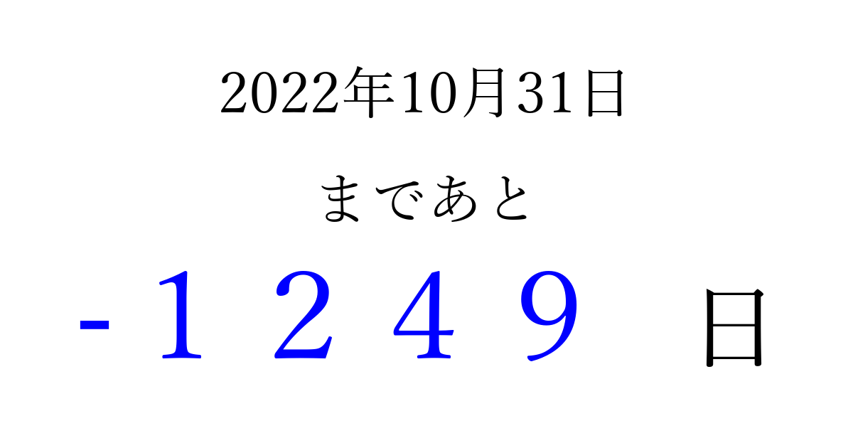 2022年10月31日(月)は もう 0000 日過ぎました 追加すると、トップページからすぐ選べるようになります ※2026/04/02現在の結果です。 最新の状態に更新する ↓シェアして、タイムライン上にカウントダウンを表示しよう!↓ 📤 この結果を共有する Tweet シェア Threads Bluesky 別の日付でカウントダウン 2022年10月のカレンダー このページをブックマークに追加すると、いつでもカウントダウンを確認できます。 (PC: Ctrl+D / Mac: ⌘+D) hitome-notes.comでは以下のページも運営しています。 指定日と期間から日付を計算 | ガチャ確率計算・シミュレーション | プライバシー・ポリシー 運営者:Avocado
