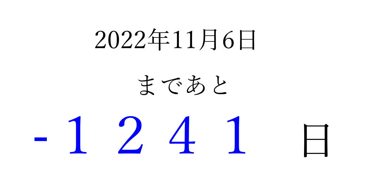 2022年11月6日(日)は もう 0000 日過ぎました 追加すると、トップページからすぐ選べるようになります ※2026/03/31現在の結果です。 最新の状態に更新する ↓シェアして、タイムライン上にカウントダウンを表示しよう!↓ 📤 この結果を共有する Tweet シェア Threads Bluesky 別の日付でカウントダウン 2022年11月のカレンダー このページをブックマークに追加すると、いつでもカウントダウンを確認できます。 (PC: Ctrl+D / Mac: ⌘+D) hitome-notes.comでは以下のページも運営しています。 指定日と期間から日付を計算 | ガチャ確率計算・シミュレーション | プライバシー・ポリシー 運営者:Avocado