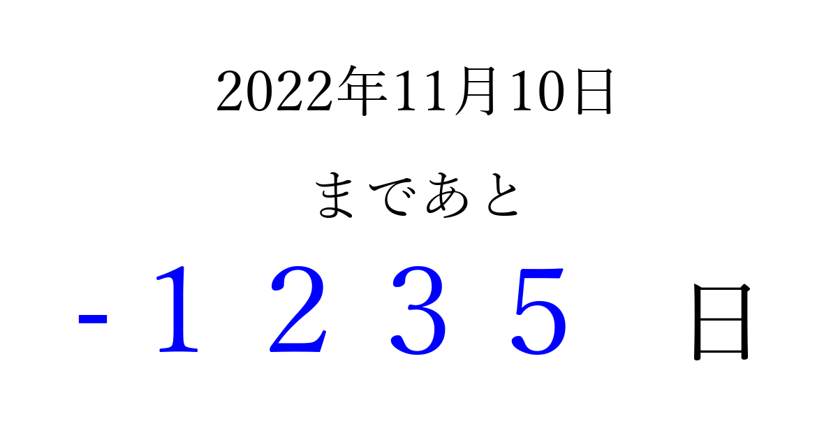 2022年11月10日(木)は もう 0000 日過ぎました 追加すると、トップページからすぐ選べるようになります ※2026/03/29現在の結果です。 最新の状態に更新する ↓シェアして、タイムライン上にカウントダウンを表示しよう!↓ 📤 この結果を共有する Tweet シェア Threads Bluesky 別の日付でカウントダウン 2022年11月のカレンダー このページをブックマークに追加すると、いつでもカウントダウンを確認できます。 (PC: Ctrl+D / Mac: ⌘+D) hitome-notes.comでは以下のページも運営しています。 指定日と期間から日付を計算 | ガチャ確率計算・シミュレーション | プライバシー・ポリシー 運営者:Avocado