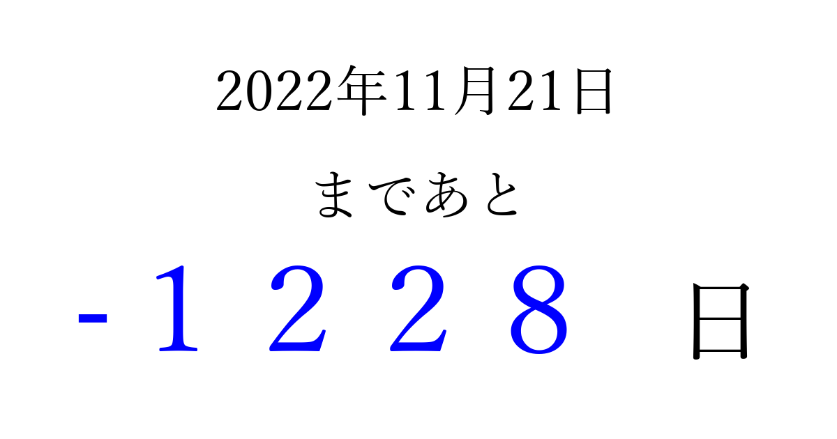 2022年11月21日(月)は もう 0000 日過ぎました 追加すると、トップページからすぐ選べるようになります ※2026/04/02現在の結果です。 最新の状態に更新する ↓シェアして、タイムライン上にカウントダウンを表示しよう!↓ 📤 この結果を共有する Tweet シェア Threads Bluesky 別の日付でカウントダウン 2022年11月のカレンダー このページをブックマークに追加すると、いつでもカウントダウンを確認できます。 (PC: Ctrl+D / Mac: ⌘+D) hitome-notes.comでは以下のページも運営しています。 指定日と期間から日付を計算 | ガチャ確率計算・シミュレーション | プライバシー・ポリシー 運営者:Avocado