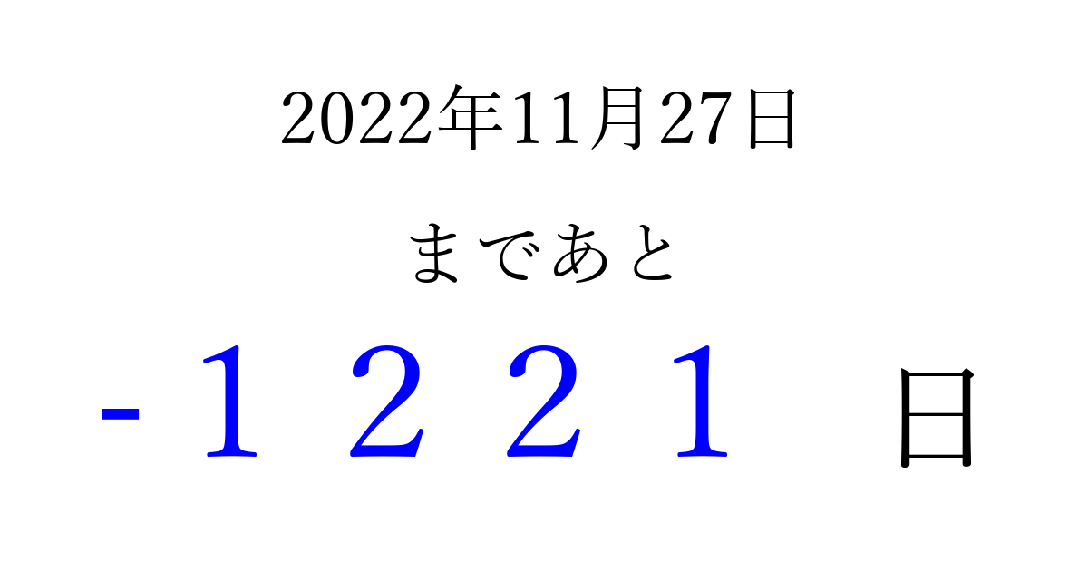 2022年11月27日(日)は もう 0000 日過ぎました 追加すると、トップページからすぐ選べるようになります ※2026/04/01現在の結果です。 最新の状態に更新する ↓シェアして、タイムライン上にカウントダウンを表示しよう!↓ 📤 この結果を共有する Tweet シェア Threads Bluesky 別の日付でカウントダウン 2022年11月のカレンダー このページをブックマークに追加すると、いつでもカウントダウンを確認できます。 (PC: Ctrl+D / Mac: ⌘+D) hitome-notes.comでは以下のページも運営しています。 指定日と期間から日付を計算 | ガチャ確率計算・シミュレーション | プライバシー・ポリシー 運営者:Avocado