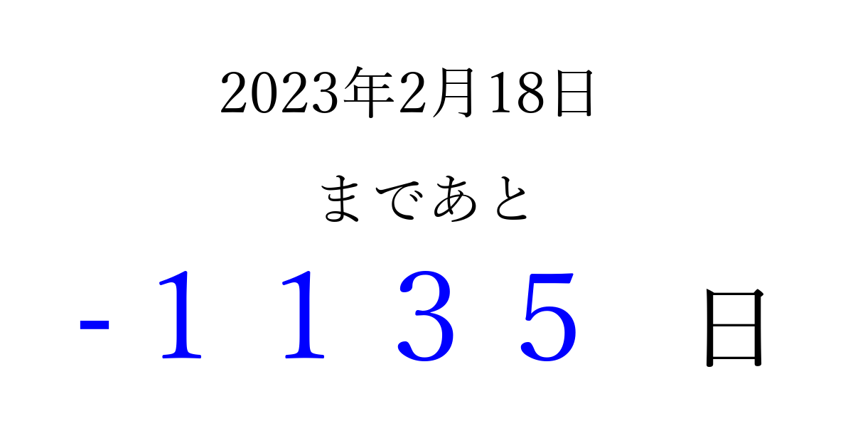 2023年2月18日(土)は もう 0000 日過ぎました 追加すると、トップページからすぐ選べるようになります ※2026/03/29現在の結果です。 最新の状態に更新する ↓シェアして、タイムライン上にカウントダウンを表示しよう!↓ 📤 この結果を共有する Tweet シェア Threads Bluesky 別の日付でカウントダウン 2023年2月のカレンダー このページをブックマークに追加すると、いつでもカウントダウンを確認できます。 (PC: Ctrl+D / Mac: ⌘+D) hitome-notes.comでは以下のページも運営しています。 指定日と期間から日付を計算 | ガチャ確率計算・シミュレーション | プライバシー・ポリシー 運営者:Avocado