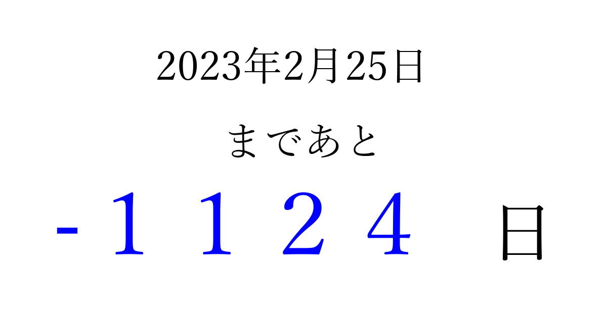 2023年2月25日(土)は もう 0000 日過ぎました 追加すると、トップページからすぐ選べるようになります ※2026/03/25現在の結果です。 最新の状態に更新する ↓シェアして、タイムライン上にカウントダウンを表示しよう!↓ 📤 この結果を共有する Tweet シェア Threads Bluesky 別の日付でカウントダウン 2023年2月のカレンダー このページをブックマークに追加すると、いつでもカウントダウンを確認できます。 (PC: Ctrl+D / Mac: ⌘+D) hitome-notes.comでは以下のページも運営しています。 指定日と期間から日付を計算 | ガチャ確率計算・シミュレーション | プライバシー・ポリシー 運営者:Avocado