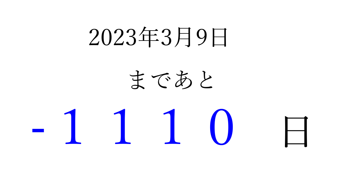 2023年3月9日(木)は もう 0000 日過ぎました 追加すると、トップページからすぐ選べるようになります ※2026/03/23現在の結果です。 最新の状態に更新する ↓シェアして、タイムライン上にカウントダウンを表示しよう!↓ 📤 この結果を共有する Tweet シェア Threads Bluesky 別の日付でカウントダウン 2023年3月のカレンダー このページをブックマークに追加すると、いつでもカウントダウンを確認できます。 (PC: Ctrl+D / Mac: ⌘+D) hitome-notes.comでは以下のページも運営しています。 指定日と期間から日付を計算 | ガチャ確率計算・シミュレーション | プライバシー・ポリシー 運営者:Avocado