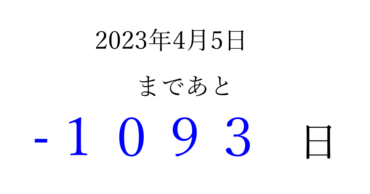 2023年4月5日(水)は もう 0000 日過ぎました 追加すると、トップページからすぐ選べるようになります ※2026/04/02現在の結果です。 最新の状態に更新する ↓シェアして、タイムライン上にカウントダウンを表示しよう!↓ 📤 この結果を共有する Tweet シェア Threads Bluesky 別の日付でカウントダウン 2023年4月のカレンダー このページをブックマークに追加すると、いつでもカウントダウンを確認できます。 (PC: Ctrl+D / Mac: ⌘+D) hitome-notes.comでは以下のページも運営しています。 指定日と期間から日付を計算 | ガチャ確率計算・シミュレーション | プライバシー・ポリシー 運営者:Avocado