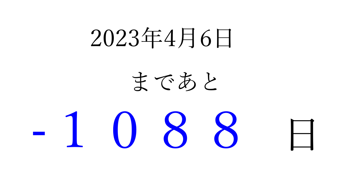 2023年4月6日(木)は もう 0000 日過ぎました 追加すると、トップページからすぐ選べるようになります ※2026/03/29現在の結果です。 最新の状態に更新する ↓シェアして、タイムライン上にカウントダウンを表示しよう!↓ 📤 この結果を共有する Tweet シェア Threads Bluesky 別の日付でカウントダウン 2023年4月のカレンダー このページをブックマークに追加すると、いつでもカウントダウンを確認できます。 (PC: Ctrl+D / Mac: ⌘+D) hitome-notes.comでは以下のページも運営しています。 指定日と期間から日付を計算 | ガチャ確率計算・シミュレーション | プライバシー・ポリシー 運営者:Avocado