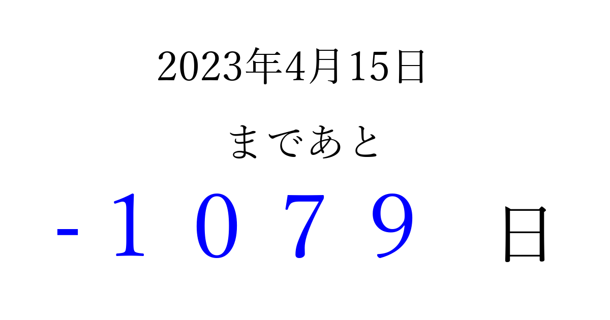 2023年4月15日(土)は もう 0000 日過ぎました 追加すると、トップページからすぐ選べるようになります ※2026/03/29現在の結果です。 最新の状態に更新する ↓シェアして、タイムライン上にカウントダウンを表示しよう!↓ 📤 この結果を共有する Tweet シェア Threads Bluesky 別の日付でカウントダウン 2023年4月のカレンダー このページをブックマークに追加すると、いつでもカウントダウンを確認できます。 (PC: Ctrl+D / Mac: ⌘+D) hitome-notes.comでは以下のページも運営しています。 指定日と期間から日付を計算 | ガチャ確率計算・シミュレーション | プライバシー・ポリシー 運営者:Avocado