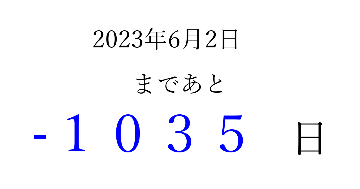 2023年6月2日(金)は もう 0000 日過ぎました 追加すると、トップページからすぐ選べるようになります ※2026/04/02現在の結果です。 最新の状態に更新する ↓シェアして、タイムライン上にカウントダウンを表示しよう!↓ 📤 この結果を共有する Tweet シェア Threads Bluesky 別の日付でカウントダウン 2023年6月のカレンダー このページをブックマークに追加すると、いつでもカウントダウンを確認できます。 (PC: Ctrl+D / Mac: ⌘+D) hitome-notes.comでは以下のページも運営しています。 指定日と期間から日付を計算 | ガチャ確率計算・シミュレーション | プライバシー・ポリシー 運営者:Avocado