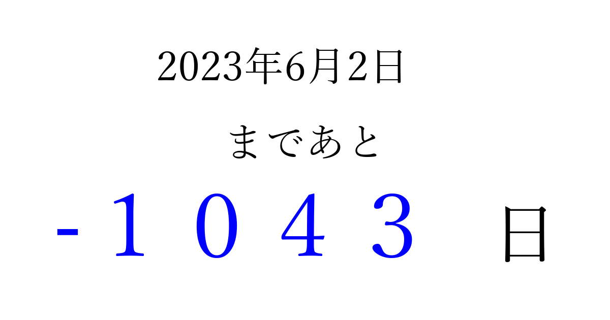 2023年6月2日(金)は もう 0000 日過ぎました 追加すると、トップページからすぐ選べるようになります ※2026/04/10現在の結果です。 最新の状態に更新する ↓シェアして、タイムライン上にカウントダウンを表示しよう!↓ 📤 この結果を共有する Tweet シェア Threads Bluesky 別の日付でカウントダウン 2023年6月のカレンダー このページをブックマークに追加すると、いつでもカウントダウンを確認できます。 (PC: Ctrl+D / Mac: ⌘+D) hitome-notes.comでは以下のページも運営しています。 指定日と期間から日付を計算 | ガチャ確率計算・シミュレーション | プライバシー・ポリシー 運営者:Avocado
