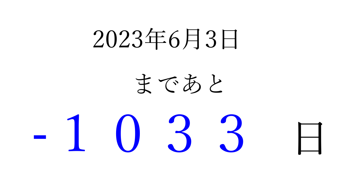 2023年6月3日(土)は もう 0000 日過ぎました 追加すると、トップページからすぐ選べるようになります ※2026/04/01現在の結果です。 最新の状態に更新する ↓シェアして、タイムライン上にカウントダウンを表示しよう!↓ 📤 この結果を共有する Tweet シェア Threads Bluesky 別の日付でカウントダウン 2023年6月のカレンダー このページをブックマークに追加すると、いつでもカウントダウンを確認できます。 (PC: Ctrl+D / Mac: ⌘+D) hitome-notes.comでは以下のページも運営しています。 指定日と期間から日付を計算 | ガチャ確率計算・シミュレーション | プライバシー・ポリシー 運営者:Avocado