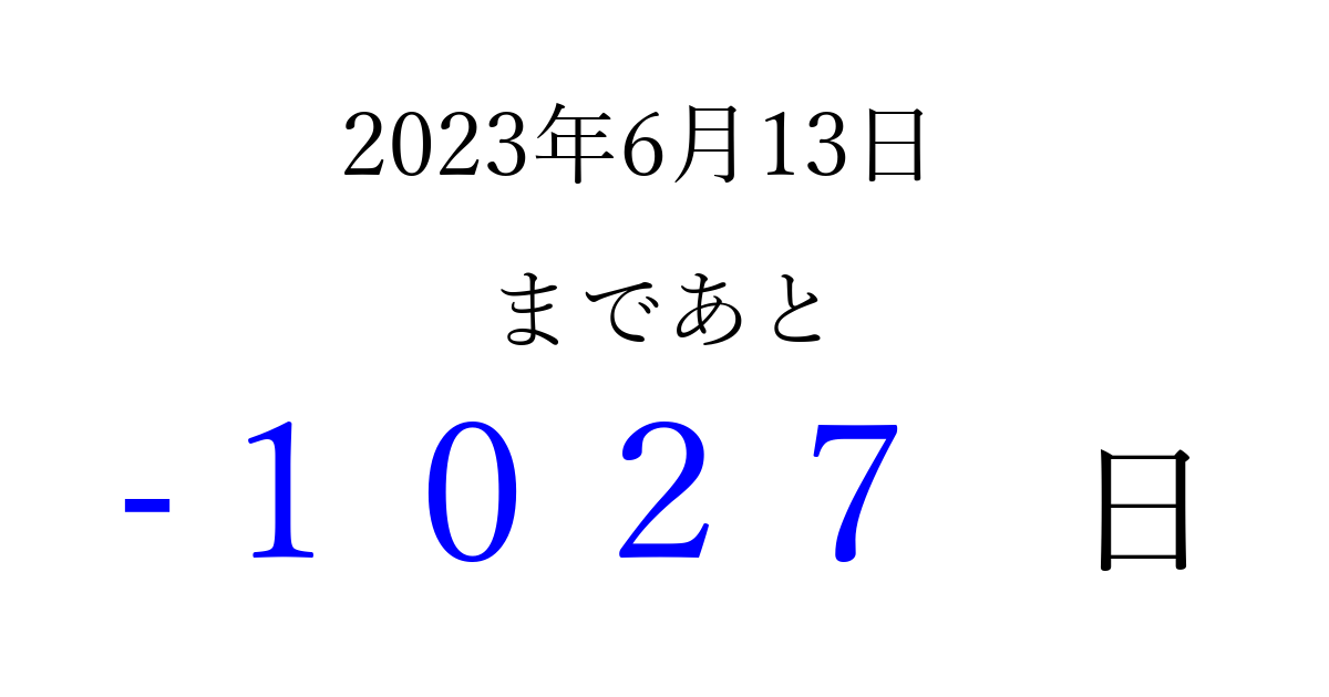 2023年6月13日(火)は もう 0000 日過ぎました 追加すると、トップページからすぐ選べるようになります ※2026/04/05現在の結果です。 最新の状態に更新する ↓シェアして、タイムライン上にカウントダウンを表示しよう!↓ 📤 この結果を共有する Tweet シェア Threads Bluesky 別の日付でカウントダウン 2023年6月のカレンダー このページをブックマークに追加すると、いつでもカウントダウンを確認できます。 (PC: Ctrl+D / Mac: ⌘+D) hitome-notes.comでは以下のページも運営しています。 指定日と期間から日付を計算 | ガチャ確率計算・シミュレーション | プライバシー・ポリシー 運営者:Avocado