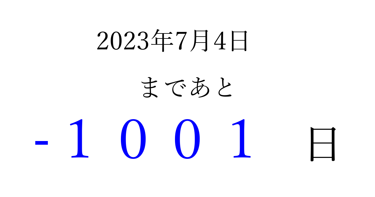 2023年7月4日(火)は もう 0000 日過ぎました 追加すると、トップページからすぐ選べるようになります ※2026/03/31現在の結果です。 最新の状態に更新する ↓シェアして、タイムライン上にカウントダウンを表示しよう!↓ 📤 この結果を共有する Tweet シェア Threads Bluesky 別の日付でカウントダウン 2023年7月のカレンダー このページをブックマークに追加すると、いつでもカウントダウンを確認できます。 (PC: Ctrl+D / Mac: ⌘+D) hitome-notes.comでは以下のページも運営しています。 指定日と期間から日付を計算 | ガチャ確率計算・シミュレーション | プライバシー・ポリシー 運営者:Avocado