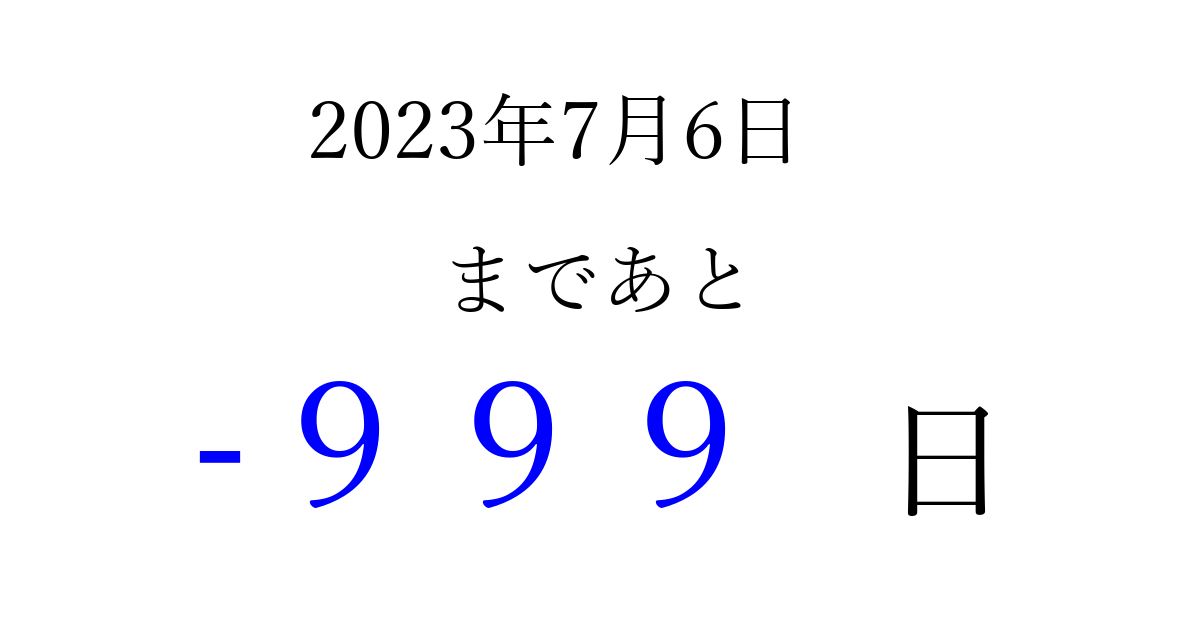 2023年7月6日(木)は もう 000 日過ぎました 追加すると、トップページからすぐ選べるようになります ※2026/03/31現在の結果です。 最新の状態に更新する ↓シェアして、タイムライン上にカウントダウンを表示しよう!↓ 📤 この結果を共有する Tweet シェア Threads Bluesky 別の日付でカウントダウン 2023年7月のカレンダー このページをブックマークに追加すると、いつでもカウントダウンを確認できます。 (PC: Ctrl+D / Mac: ⌘+D) hitome-notes.comでは以下のページも運営しています。 指定日と期間から日付を計算 | ガチャ確率計算・シミュレーション | プライバシー・ポリシー 運営者:Avocado